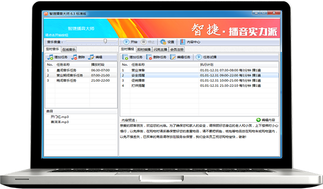 智捷播音大师 专注于商业播音,无论您是超市、大卖场、购物中心,还是酒店,餐馆。我们熟悉您的日常工作及面临的挑战,给您提供易于使用的产品,并全面满足您的经营诉求。